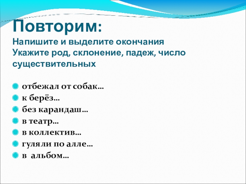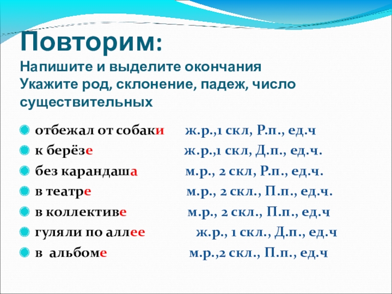 Повторим: Напишите и выделите окончания Укажите род, склонение, падеж, число существительныхотбежал от собак…к берёз…без карандаш…в театр…в коллектив…гуляли