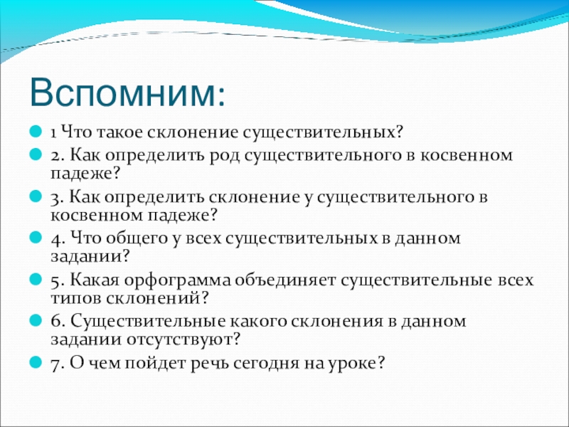 Вспомним:1 Что такое склонение существительных?2. Как определить род существительного в косвенном падеже?3. Как определить склонение у существительного