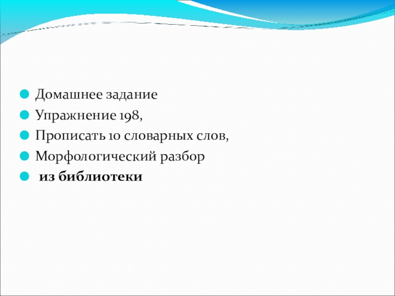 Домашнее заданиеУпражнение 198,Прописать 10 словарных слов,Морфологический разбор из библиотеки