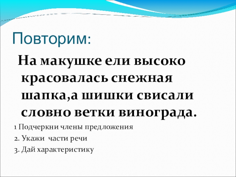 Повторим: На макушке ели высоко красовалась снежная шапка,а шишки свисали словно ветки винограда.1 Подчеркни члены предложения2. Укажи