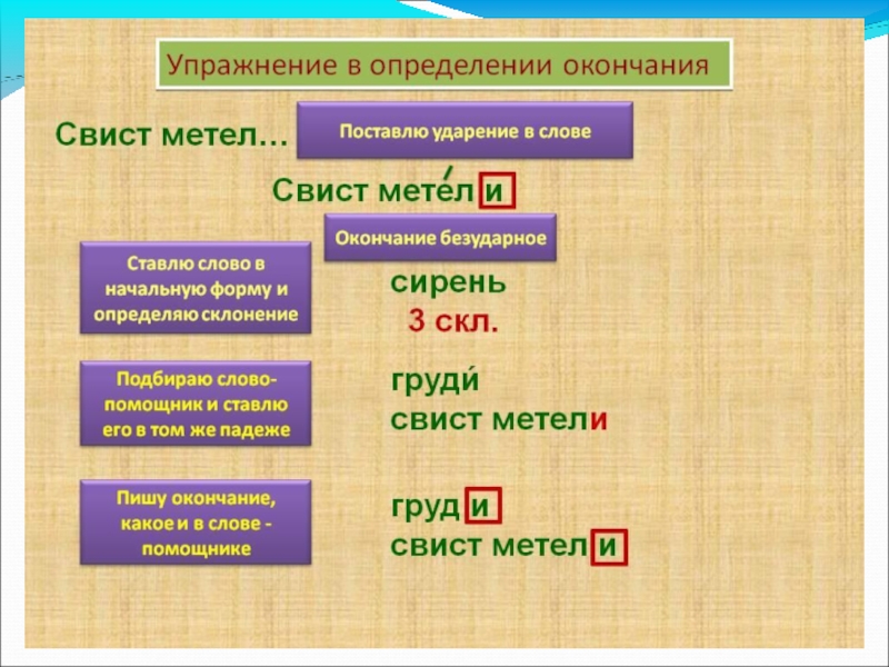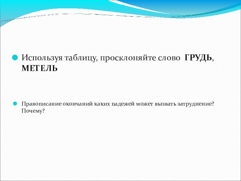 Слайд 10Используя таблицу, просклоняйте слово ГРУДЬ, МЕТЕЛЬ