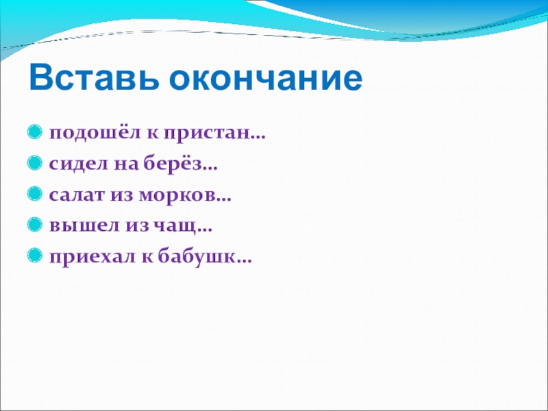 Вставь окончание подошёл к пристан…сидел на берёз…салат из морков…вышел из чащ…приехал к бабушк…