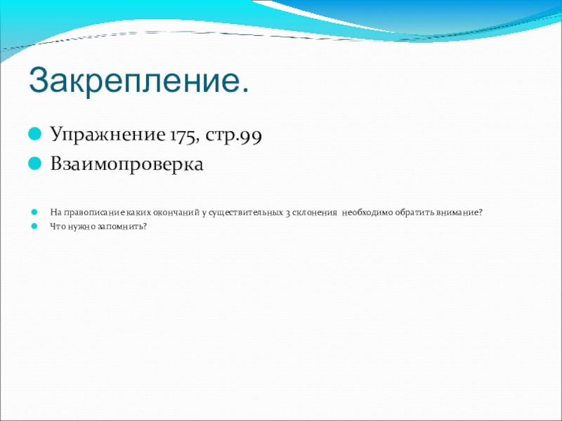Закрепление. Упражнение 175, стр.99ВзаимопроверкаНа правописание каких окончаний у существительных 3 склонения необходимо обратить внимание?Что нужно запомнить?