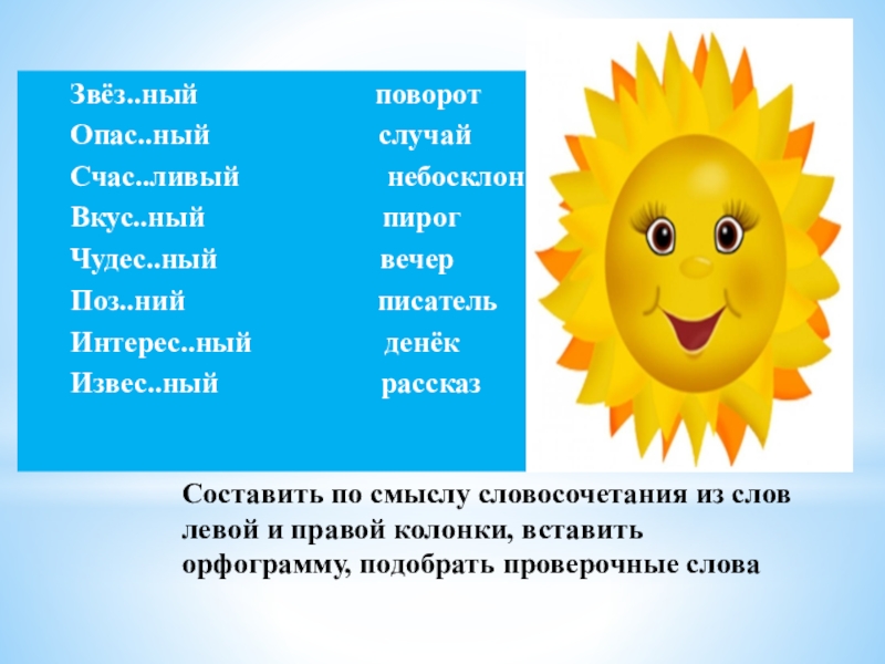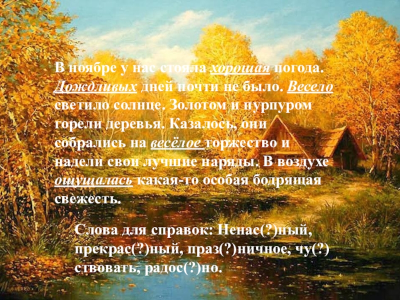 Слова для справок: Ненас(?)ный, прекрас(?)ный, праз(?)ничное, чу(?)ствовать, радос(?)но.