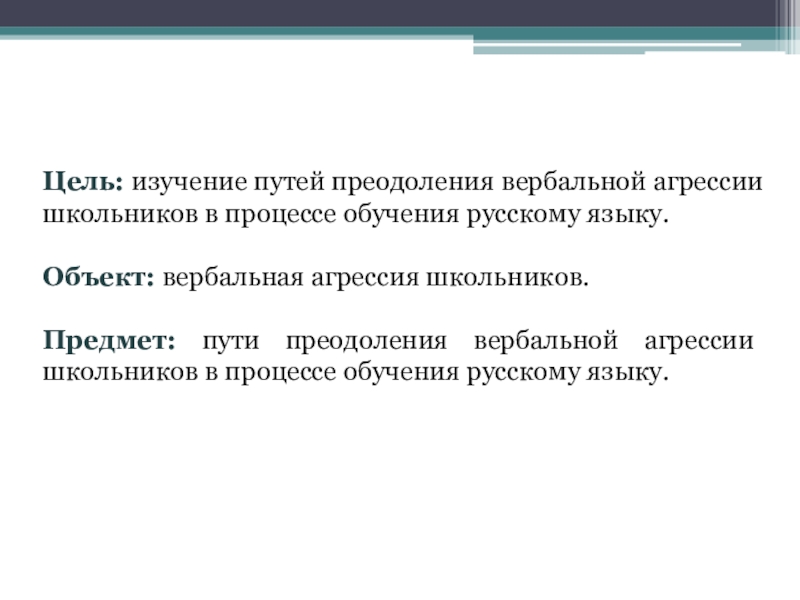 Слайд 2Цель: изучение путей преодоления вербальной агрессии школьников в процессе обучения русскому