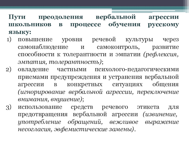 Слайд 7Пути преодоления вербальной агрессии школьников в процессе обучения русскому языку: