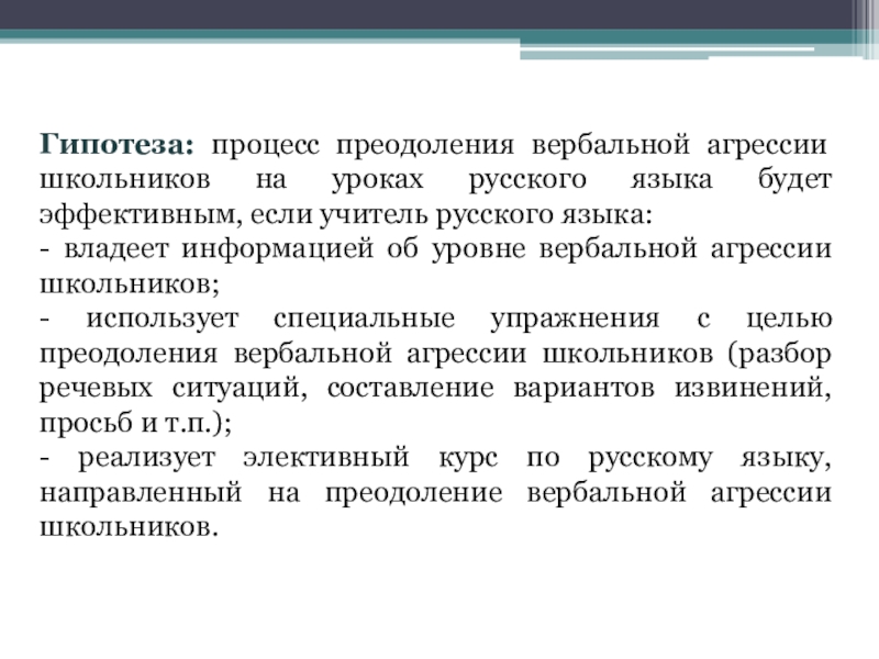 Слайд 3Гипотеза: процесс преодоления вербальной агрессии школьников на уроках русского языка будет