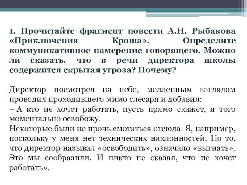 Слайд 101. Прочитайте фрагмент повести А.Н. Рыбакова «Приключения Кроша». Определите коммуникативное намерение