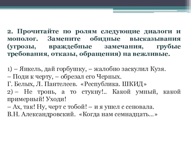 Слайд 112. Прочитайте по ролям следующие диалоги и монолог. Замените обидные высказывания