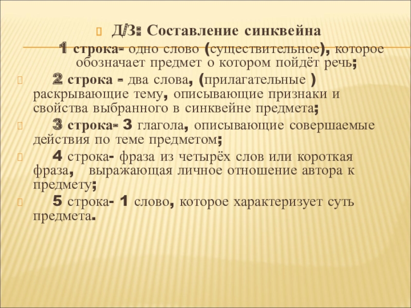 Д/З: Составление синквейна     1 строка- одно слово (существительное), которое обозначает предмет о котором пойдёт речь;    2 строка - два слова, (прилагательные