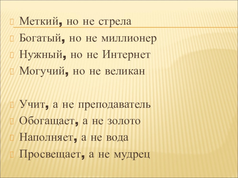 Меткий, но не стрелаБогатый, но не миллионерНужный, но не ИнтернетМогучий, но не великан Учит, а не преподавательОбогащает, а
