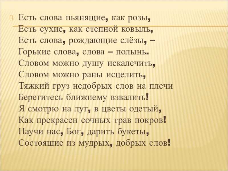 Есть слова пьянящие, как розы, Есть сухие, как степной ковыль, Есть слова, рождающие слёзы, – Горькие слова,