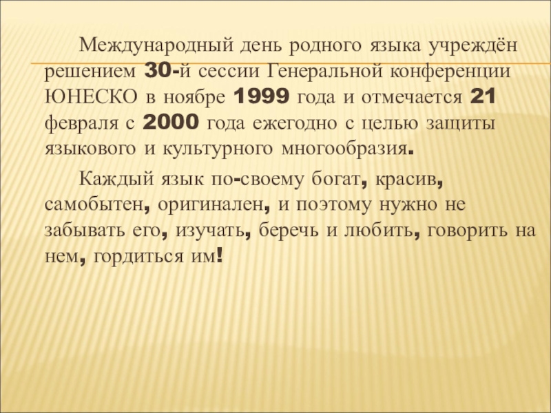Международный день родного языка учреждён решением 30-й сессии Генеральной конференции ЮНЕСКО в ноябре 1999 года и отмечается 21 февраля с 2000 года ежегодно с целью защиты языкового и культурного многообразия. Каждый язык по-своему богат, красив, самобытен,