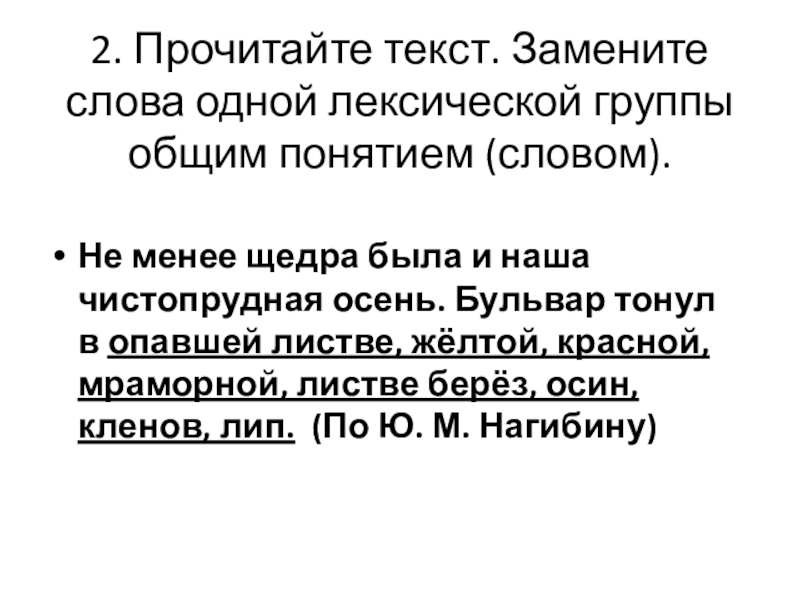 Слайд 72. Прочитайте текст. Замените слова одной лексической группы общим понятием (словом).