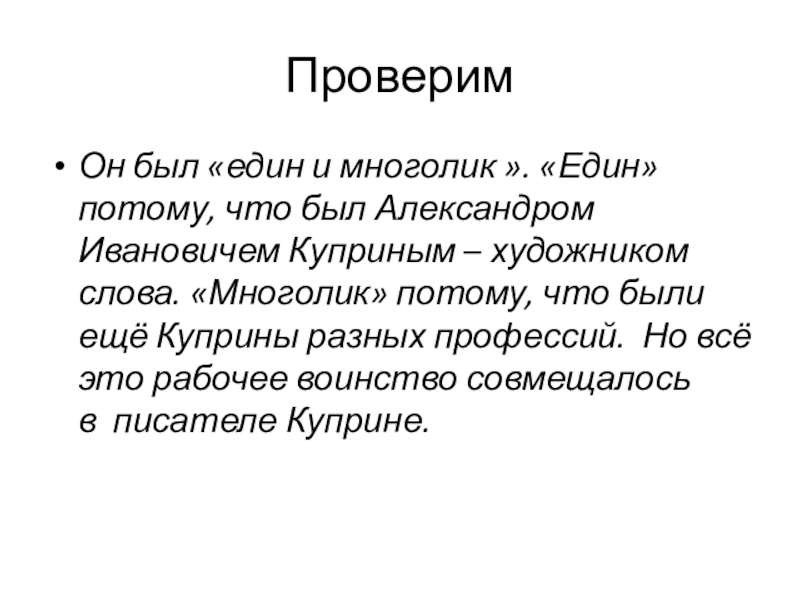 многолик ». «Един» потому, что был Александром Ивановичем Куприным – художником слова, своеобразным и неповторимым. «Многолик» потому, что были ещё Куприны: один – землемер, другой – грузчик, третий – учётчик на заводе, спортсмен, носильщик на вокзале, певец в хоре. И много, много других. Но всё это рабочее воинство совмещалось в одном лице – писателе Куприне. (По Б. Д. Челышеву)