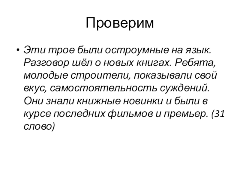 Ребята, молодые строители, показывали свой вкус, самостоятельность суждений. Они знали книжные новинки и были в курсе последних фильмов и премьер. (31 слово)
