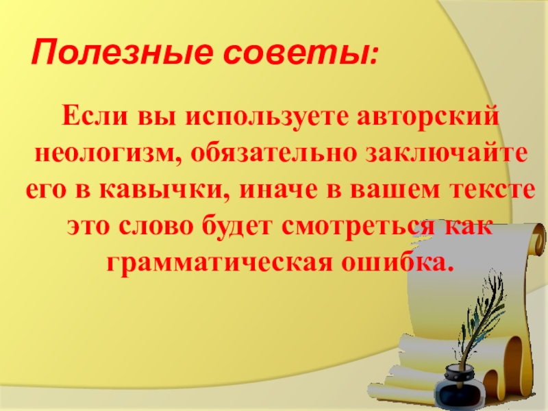 Если вы используете авторский неологизм, обязательно заключайте его в кавычки,