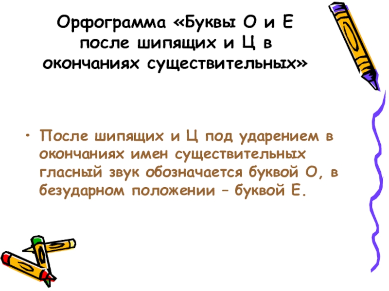 После шипящих и Ц под ударением в окончаниях имен существительных гласный звук обозначается буквой О, в безударном положении – буквой Е.