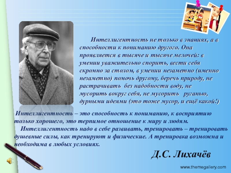 Интеллигентность – это способность к пониманию, к восприятию только хорошего, это терпимое отношение к миру и людям.