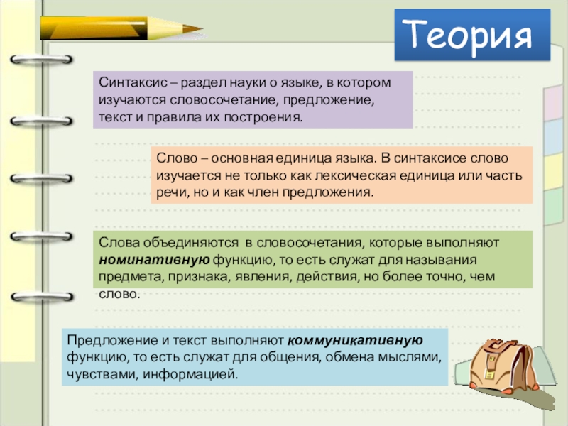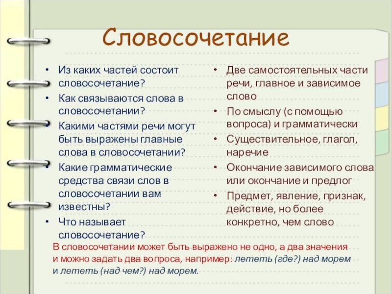 Слова объединяются в словосочетания, которые выполняют номинативную функцию, то есть служат для называния предмета, признака, явления, действия, но более точно, чем слово.