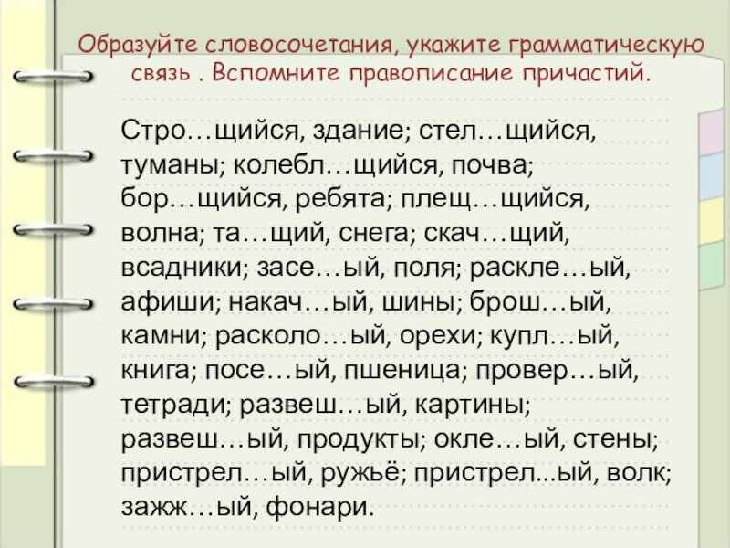 Слайд 19Образуйте словосочетания, укажите грамматическую связь . Вспомните правописание причастий.