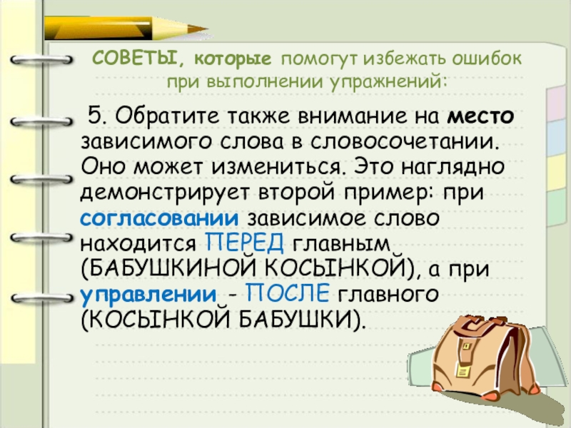 на место зависимого слова в словосочетании. Оно может измениться. Это наглядно демонстрирует второй пример: при согласовании зависимое слово находится ПЕРЕД главным (БАБУШКИНОЙ КОСЫНКОЙ), а при управлении - ПОСЛЕ главного (КОСЫНКОЙ БАБУШКИ).