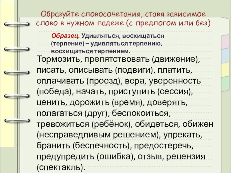 Тормозить, препятствовать (движение), писать, описывать (подвиги), платить, оплачивать (проезд), вера, уверенность (победа), начать, приступить (сессия), ценить, дорожить (время), доверять, полагаться (друг), беспокоиться, тревожиться (ребёнок), обидеться, обижен (несправедливым решением), упрекать, бранить (беспечность), предостеречь, предупредить (ошибка), отзыв, рецензия (спектакль).