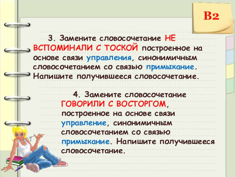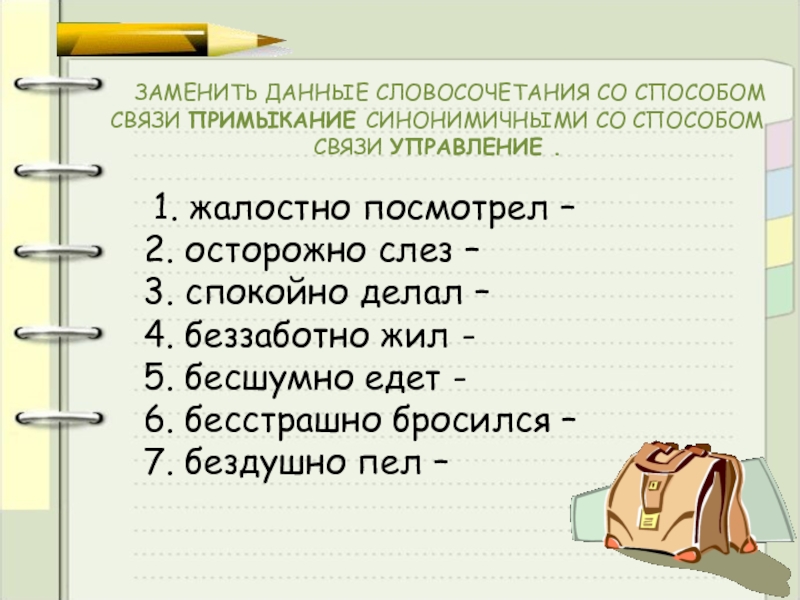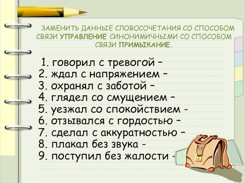 ЗАМЕНИТЬ ДАННЫЕ СЛОВОСОЧЕТАНИЯ СО СПОСОБОМ СВЯЗИ ПРИМЫКАНИЕ СИНОНИМИЧНЫМИ СО