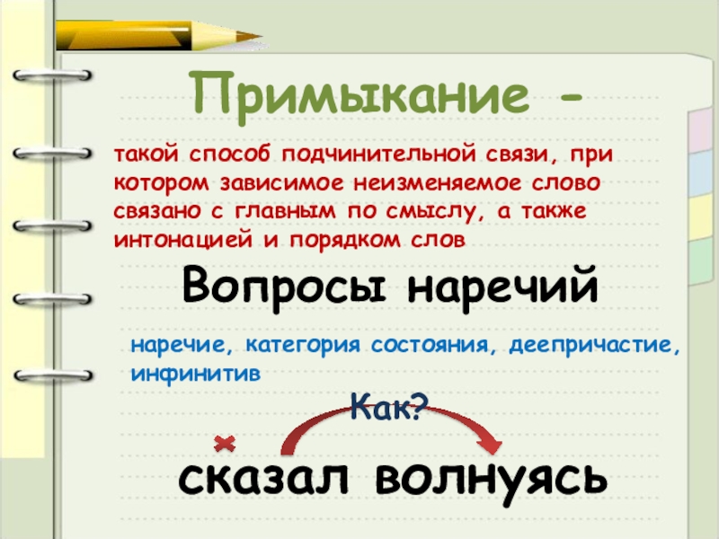 такой способ подчинительной связи, при котором зависимое неизменяемое слово