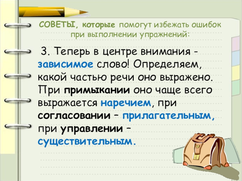зависимое слово! Определяем, какой частью речи оно выражено. При примыкании оно чаще всего выражается наречием, при согласовании – прилагательным, при управлении – существительным.