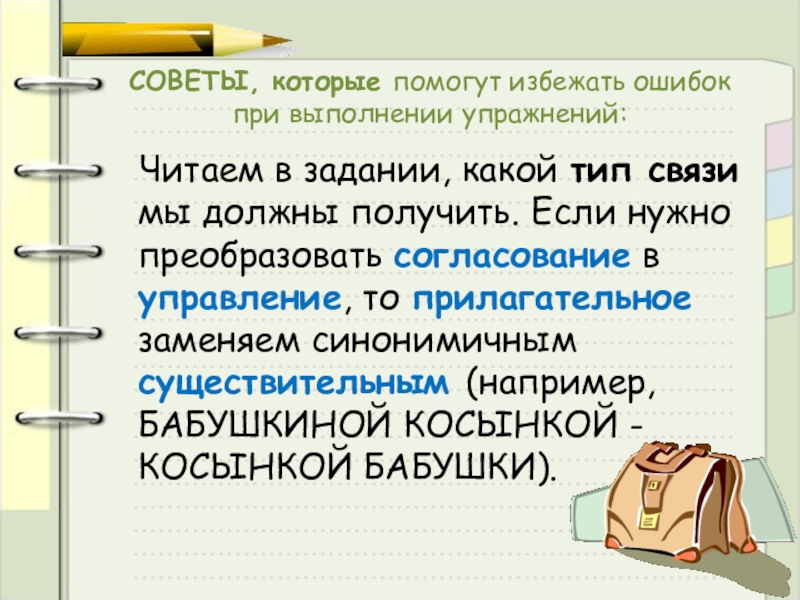 задании, какой тип связи мы должны получить. Если нужно преобразовать согласование в управление, то прилагательное заменяем синонимичным существительным (например, БАБУШКИНОЙ КОСЫНКОЙ - КОСЫНКОЙ БАБУШКИ).
