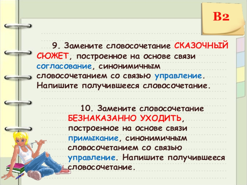 Слайд 40 9. Замените словосочетание СКАЗОЧНЫЙ СЮЖЕТ, построенное на основе связи согласование, синонимичным
