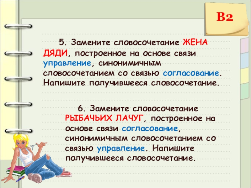 Слайд 38 5. Замените словосочетание ЖЕНА ДЯДИ, построенное на основе связи управление, синонимичным