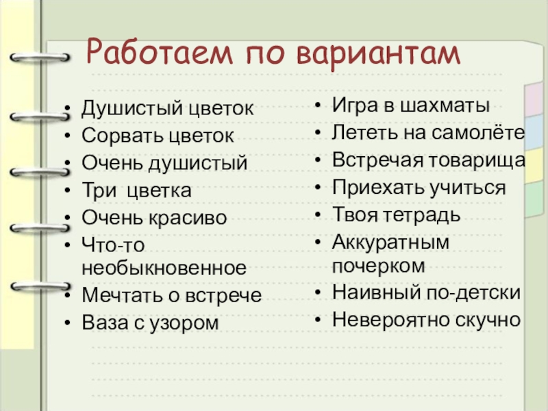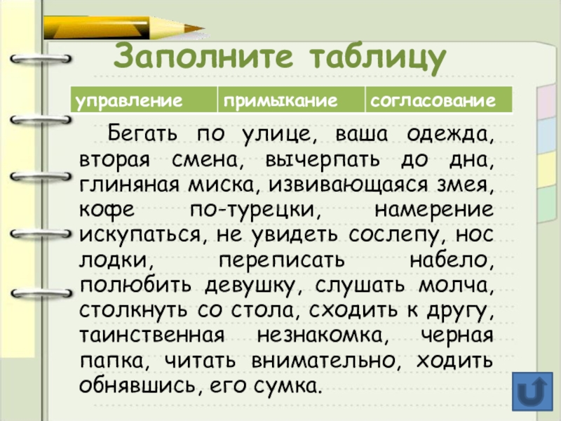 до дна, глиняная миска, извивающаяся змея, кофе по-турецки, намерение искупаться, не увидеть сослепу, нос лодки, переписать набело, полюбить девушку, слушать молча, столкнуть со стола, сходить к другу, таинственная незнакомка, черная папка, читать внимательно, ходить обнявшись, его сумка.