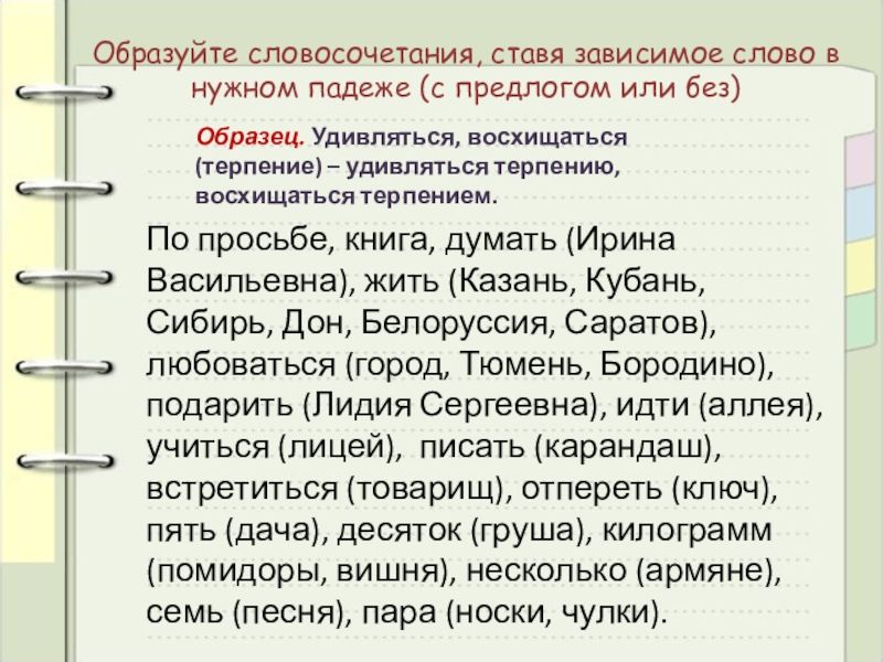 Слайд 16Образуйте словосочетания, ставя зависимое слово в нужном падеже (с предлогом или