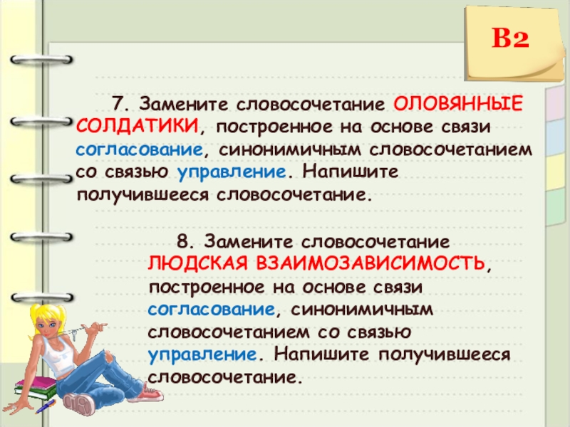 Слайд 39 7. Замените словосочетание ОЛОВЯННЫЕ СОЛДАТИКИ, построенное на основе связи согласование, синонимичным