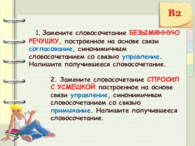 Слайд 36 1. Замените словосочетание БЕЗЫМЯННУЮ РЕЧУШКУ, построенное на