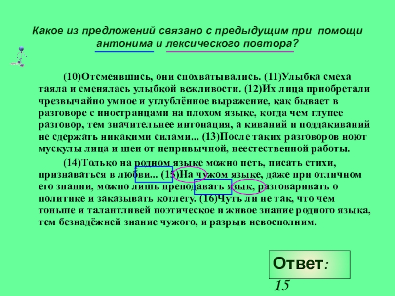 (14)Только на родном языке можно петь, писать стихи, признаваться в любви... (15)На чужом языке, даже при отличном его знании, можно лишь преподавать язык, разговаривать о политике и заказывать котлету. (16)Чуть ли не так, что чем тоньше и талантливей поэтическое и живое знание родного языка, тем безнадёжней знание чужого, и разрыв невосполним.