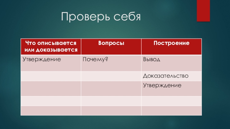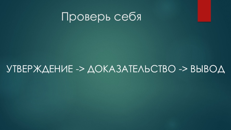 Проверь себяУТВЕРЖДЕНИЕ -> ДОКАЗАТЕЛЬСТВО -> ВЫВОД