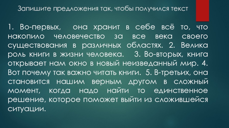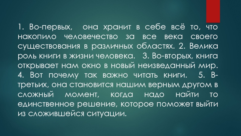 в себе всё то, что накопило человечество за все века своего существования в различных областях. 2. Велика роль книги в жизни человека. 3. Во-вторых, книга открывает нам окно в новый неизведанный мир. 4. Вот почему так важно читать книги. 5. В-третьих, она становится нашим верным другом в сложный момент, когда надо найти то единственное решение, которое поможет выйти из сложившейся ситуации.