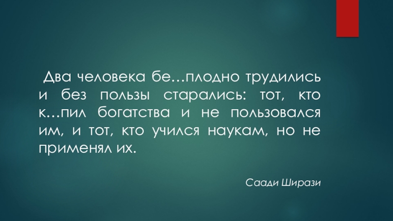 Два человека бе…плодно трудились и без пользы старались: тот, кто к…пил богатства и не пользовался им, и тот, кто учился наукам, но не применял их.Саади Ширази