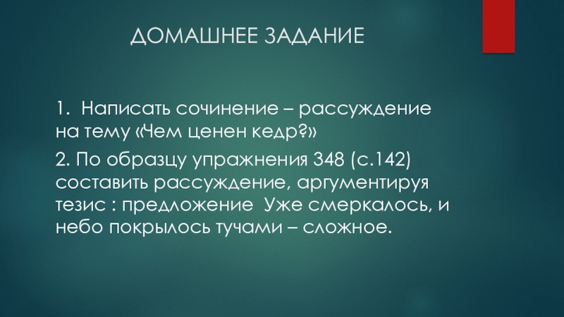 ДОМАШНЕЕ ЗАДАНИЕ1. Написать сочинение – рассуждение на тему «Чем ценен кедр?»2. По образцу упражнения 348 (с.142) составить