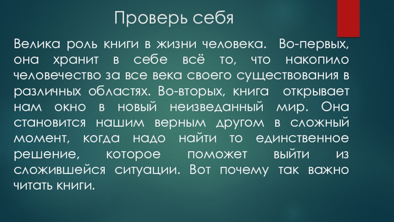 Проверь себяВелика роль книги в жизни человека. Во-первых, она хранит в себе всё то, что накопило человечество