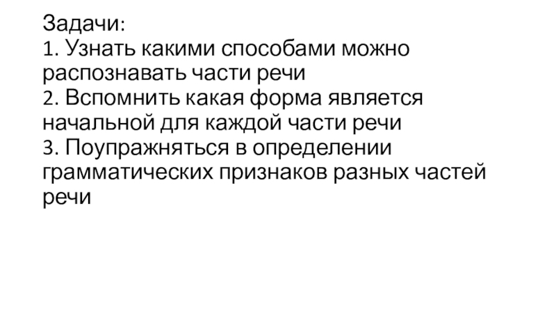 Слайд 6Задачи: 1. Узнать какими способами можно распознавать части речи 2. Вспомнить какая форма