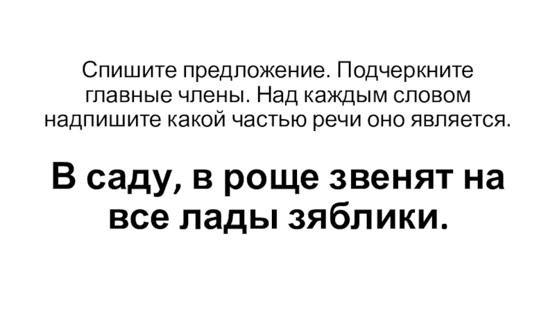 Спишите предложение. Подчеркните главные члены. Над каждым словом надпишите какой частью речи оно является. В саду, в роще звенят на все лады зяблики.
