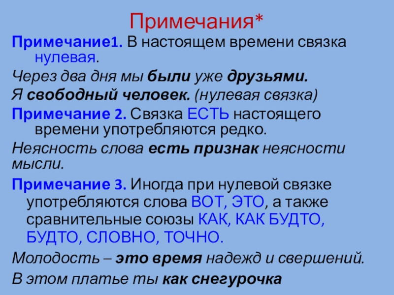 Примечание 3. Иногда при нулевой связке употребляются слова ВОТ, ЭТО, а также сравнительные союзы КАК, КАК БУДТО, БУДТО, СЛОВНО, ТОЧНО.