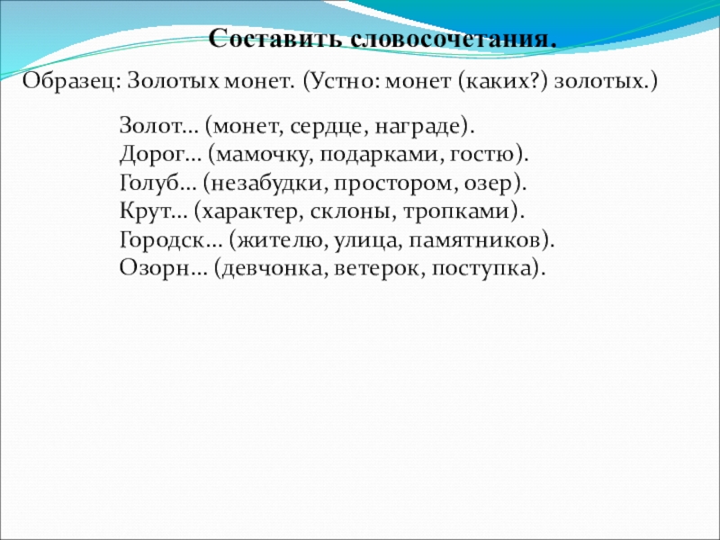Образец: Золотых монет. (Устно: монет (каких?) золотых.)