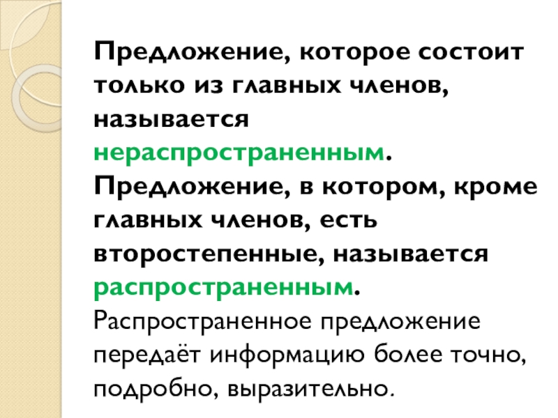 котором, кроме главных членов, есть второстепенные, называется распространенным. Распространенное предложение передаёт информацию более точно, подробно, выразительно.