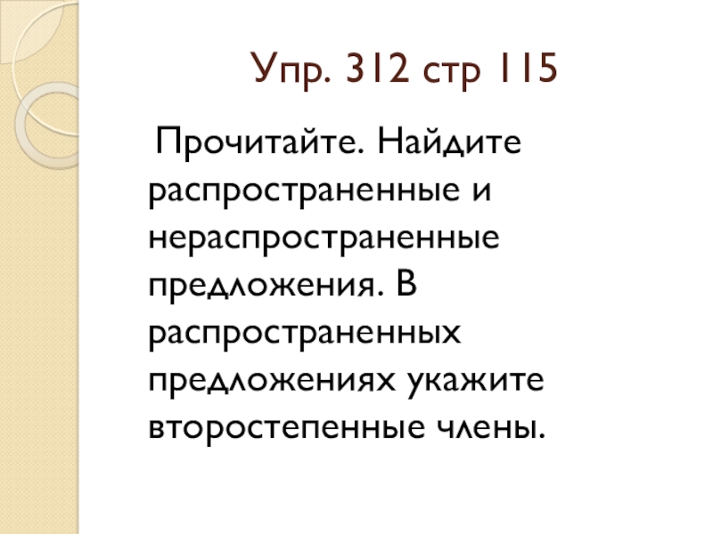 Упр. 312 стр 115 	Прочитайте. Найдите распространенные и нераспространенные предложения. В распространенных предложениях укажите второстепенные члены.