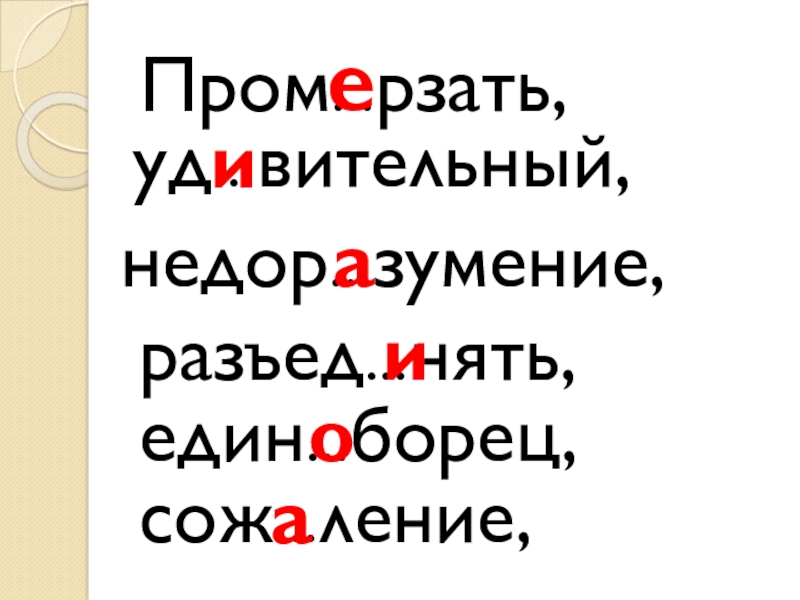 Пром…рзать, уд…вительный,недор…зумение,разъед…нять,един…борец,сож…ление, еиаиоа